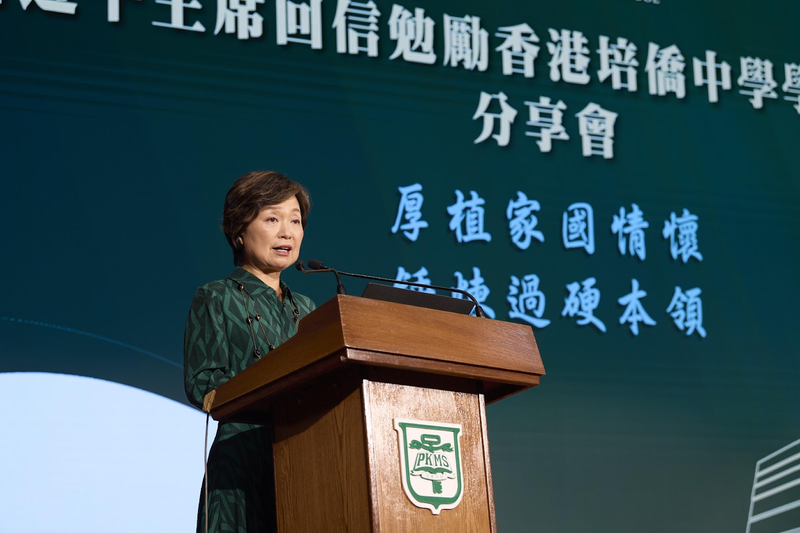 隨後,教育局局長蔡若蓮博士在分享會中回顧了習近平主席於去年7月24日給香港培僑中學學生回信的重要時刻,表達了習主席對香港年輕一代的深切期望。她強調,教育局在過去一年中積極落實習主席的回信精神,以「立德樹人」為核心目標,致力於培養具有深厚家國情懷的年輕一代。蔡局長詳細介紹了教育局在優化課程、開發教學資源、提供教師培訓等方面的努力,並特別提到了支持學校組織全方位學習活動,如內地交流和考察,以拓寬學生視野。她還對學界和學生的積極參與表示感謝,並提到自去年內地與香港全面通關後,教育局迅速開展與高中公民與社會發展科課程相結合的內地考察活動,至今已有近95,000名學生參與。此外,學生內地交流計劃每年提供超過100,000個交流名額,確保每位學生在中小學階段至少有一次到內地交流的機會,讓他們親身體驗國家的最新發展和成就。